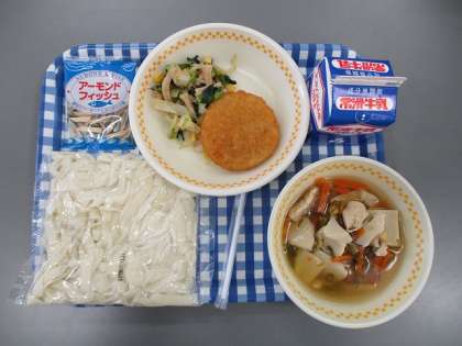 きしめん ぎゅうにゅう わふうかけじる さつまいもコロッケ ちぐさあえ アーモンドいりかんそうこざかな です