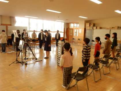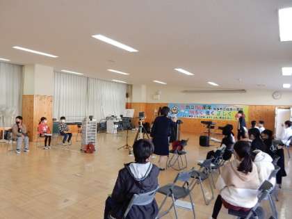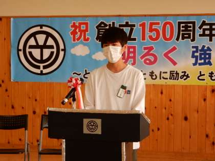 11/25(金) 記念式典 公開日 2022/11/25 更新日 2022/11/25 全校 本日、岡田小学校150周年記念式典を開催しました。始業式や終業式と同じように集会室をメイン会場として、リモートで行いました。開会の言葉の後、国歌斉唱、前期児童会長の挨拶です。