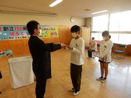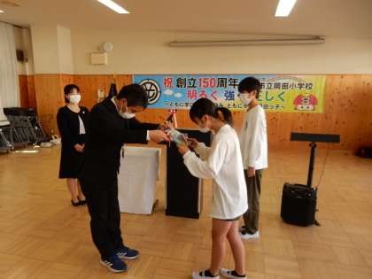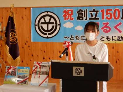 「誓いの言葉」を、児童を代表して後期児童会長が力強く述べてくれました。記念品贈呈です。岡田小学校の歴史と現在をまとめたリーフレットと高級写真を印刷したクリアファイルを開校150周年の記念品として贈呈しました。