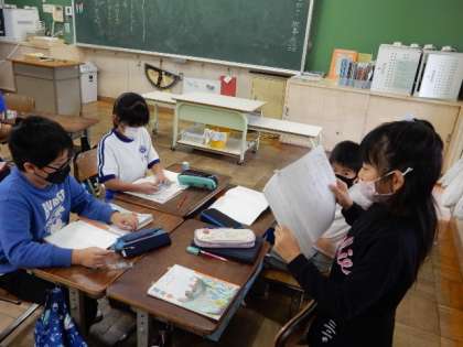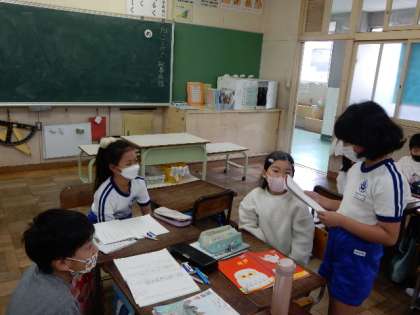国語です。「つたわる言葉(ことわざ・故事成語)」の学習です。自分たちで調べた、ことわざや故事成語の意味や使い方をグループ内で発表し合って共有しています。