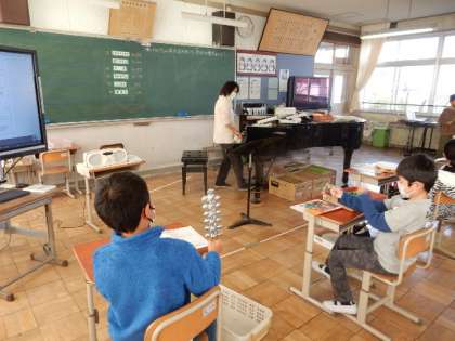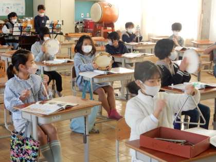 12/1(木) 3年生 公開日 2022/12/01 更新日 2022/12/01 3年生 音楽です。「雪のおどり」の練習です。トライアングル、タンブリン、すず、スレイベル、鉄琴、木琴のパートに分かれ練習しています。