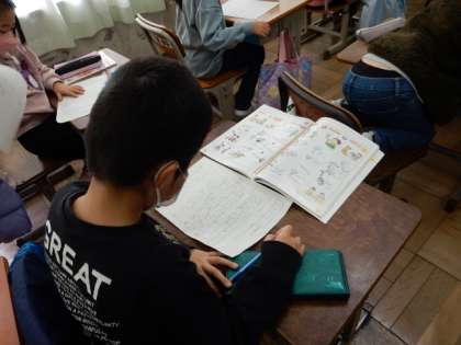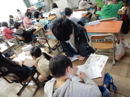 生活科です。「作ってあそぼううごくおもちゃ」の学習です。紙コップや牛乳パックなどを使って、動くおもちゃを作ります。教科書を参考に設計図を書いて、友だちと説明し合います。