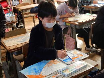 図工です。版画の製作です。一生懸命細かいところまで彫った作品、彩色にも力が入ります。