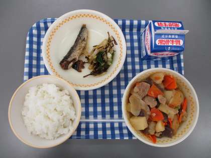 今日の献立は」 ごはん ぎゅうにゅう いわしうめに にくじゃが はくさいのこんぶあえ です