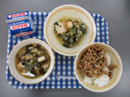 今日の献立は ごはん ぎゅうにゅう あなごごはんのぐ こまつなのいためもの みだくさんじる