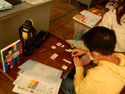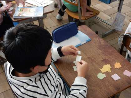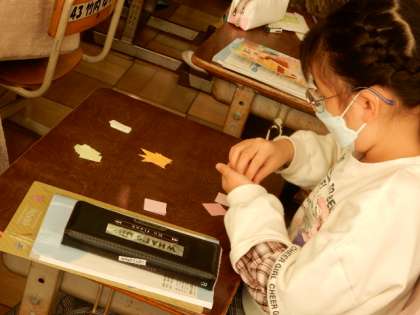 12/12(月) 2年生 公開日 2022/12/12 更新日 2022/12/12 2年生 算数です。「三角形と 四角形」の学習です。教科書付録の「もようづくりの色紙」を使って発展学習です。色紙を2枚並べて、長方形や正方形、直角三角形を作ります。