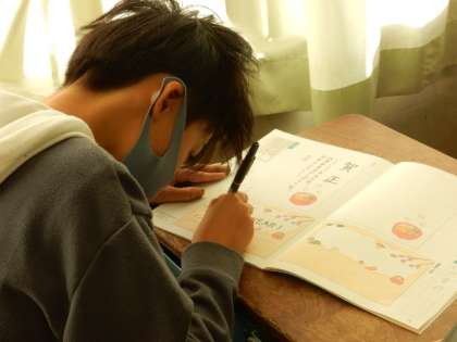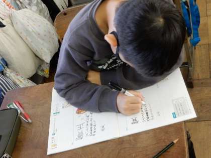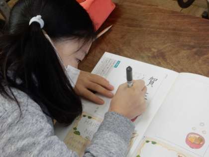 書写です。硬筆です。年賀状の書き方を学び、実際のはがきの大きさの枠に、年賀の挨拶と言葉を添えて、練習しています。おうちでも実践できるといいですね。