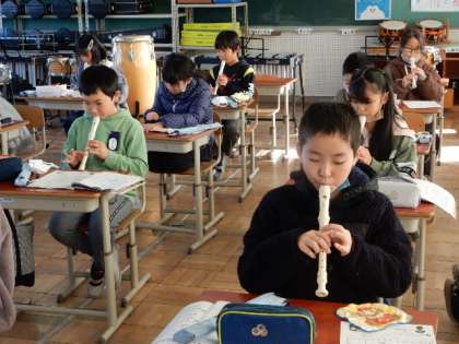 12/19(月) 4年生 公開日 2022/12/19 更新日 2022/12/19 4年生 音楽です。「音階をもとにして音楽をつくろう」がめあてです。「さくらさくら」で使われている「ミ・ファ・ラ・シ・ド・ミ」を使って簡単な作曲をします。リコーダーで音を確かめながら作曲です。