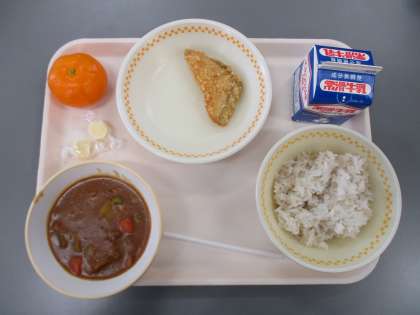 今日の献立は むぎごはん ぎゅうにゅう カレーライス こめこのホキフライ みかん キャンディチーズ です