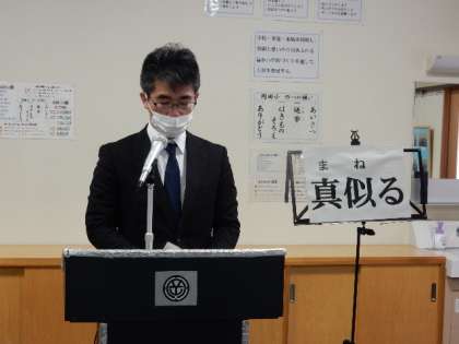 1/10(火) 始業式 公開日 2023/01/10 更新日 2023/01/10 全校 始業式です。私からは3学期にも成長を感じられるように目標をもって過ごしてほしいことを話しました。「こんな人になりたい」と思う人を「真似る」ことが成長に繋がることを伝えました。