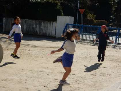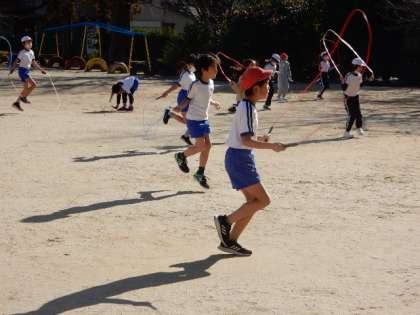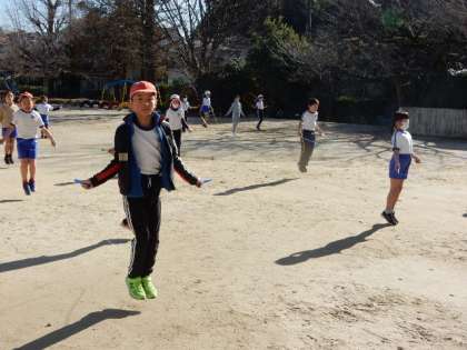 体育です。なわとび運動です。自分自身の最高記録が出たり、新しい技ができるようになったりした喜びの声が、あちらこちらから聞こえてきます。
