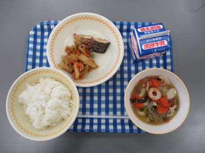 今日の献立は ごはん ぎゅうにゅう ぶりのてりやき きんぴられんこん しらたまぞうに です
