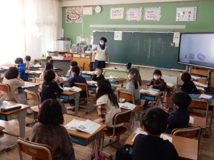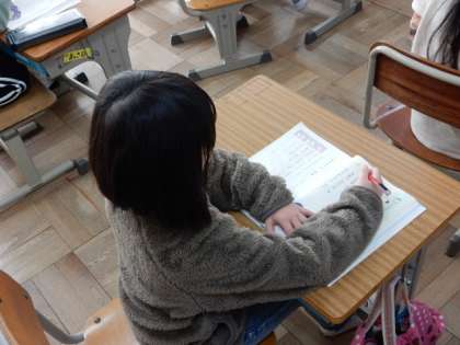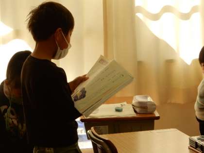 国語です。「こえに 出して よもう」の学習です。「かたつむりのでんきち」「はちみつのゆめ」という詩を元気に音読です。みんな上手に音読できるようになりましたね。