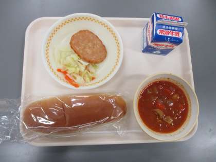 今日の献立は ミルクロールパン ぎゅうにゅう チキンハムステーキ やさいのレモンふうみ ポークビーンズ です
