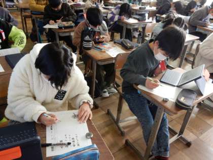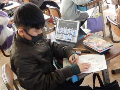 1/12(木) 5年生 公開日 2023/01/12 更新日 2023/01/12 5年生 国語です。「季節の言葉(冬の朝)」の学習です。 冬のどんなところが好きか、冬らしい物や様子を、文章に書き表しています。