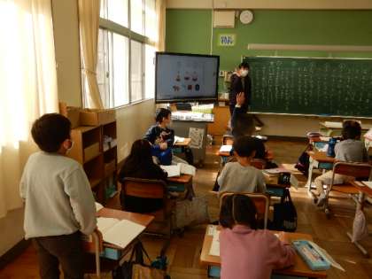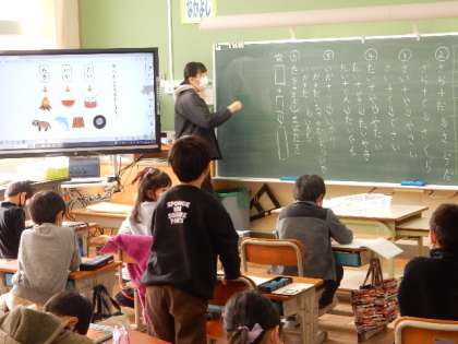 1/13(金) 1年生 公開日 2023/01/13 更新日 2023/01/13 1年生 国語です。「たのしいな,ことばあそび」の学習です。「たい」に「こ」をつけて「たいこ」、「や」をつけたら「たいや」のように、言葉と言葉をつなげて変身させていきます。