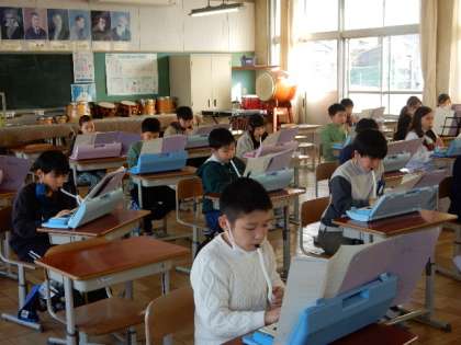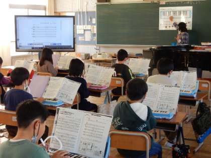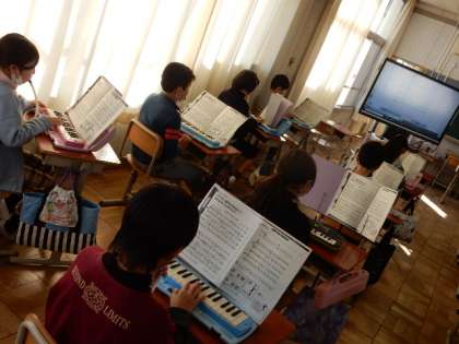 1/19(木) 4年生 公開日 2023/01/19 更新日 2023/01/19 4年生 音楽です。「ラ クンパルシータ」という曲を鍵盤ハーモニカで演奏する練習をしています。リコーダー演奏練習をしています。パートの役割を生かして生き生きと演奏することが目標です。
