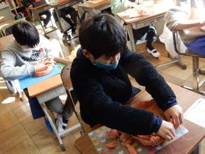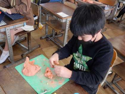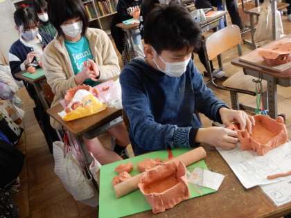 図工です。「使って楽しい焼き物」の製作です。乾くと焼き物のようになる粘土を使って、お皿や湯飲み、鉛筆立てなど思い思いの焼き物を作り始めました。
