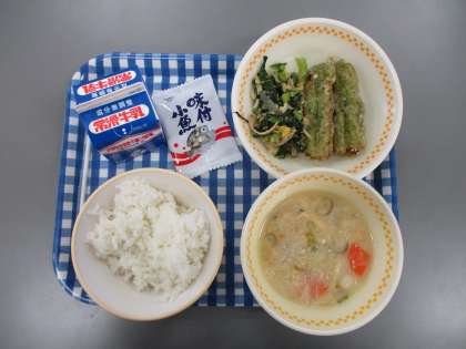 1/19(木) 給食 公開日 2023/01/19 更新日 2023/01/19 給食 今日の献立は ごはん ぎゅうにゅう ちくわのいそべあげ エリンギとあおなのごまあえ じゃがいもいりごじる かんそうこざかな です