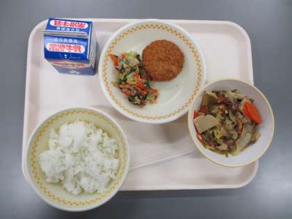 今日の献立は ごはん ぎゅうにゅう わふうコロッケ なごやコーチンのひきずり やさいとツナのあえもの です