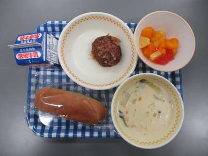 1/25(水) 給食 公開日 2023/01/25 更新日 2023/01/25 給食 今日の献立は あいちのこめこいりパン ぎゅうにゅう ハンバーグのたまねぎソースかけ ふゆやさいのクリームシチュー いちごゼリーいりポンチ です