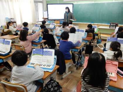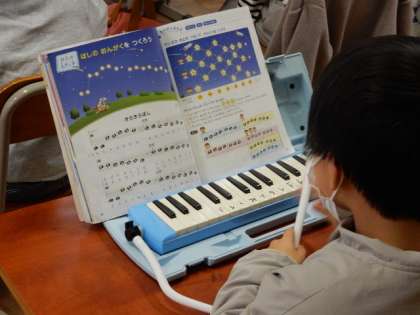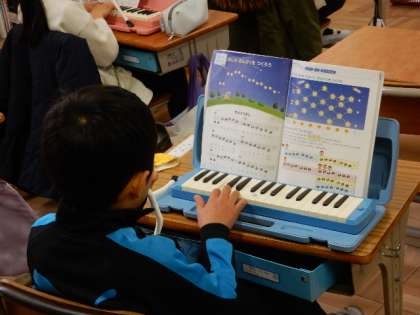 1/27(金) 公開日 2023/01/27 更新日 2023/01/27 1年生 音楽です。「きらきらぼし」を練習しています。階名で歌って音を確かめた後、鍵盤ハーモニカで練習です。指使いもなれてきましたね。