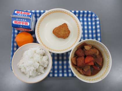 今日の献立は ごはん ぎゅうにゅう ちたはんとうさんぶたのヒレカツ みそおでん ぽんかん です