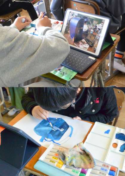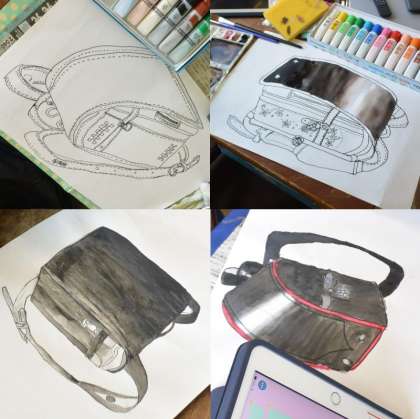 ランドセル どんな形か iPadで写真を撮って しっかり見て描いたよ 光の描写は、色の塗り方を工夫したよ