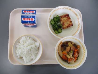 今日の献立は ごはん ぎゅうにゅう チキンたつたあげ にくじゃが きゅうりとわかめのあえもの です