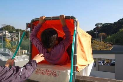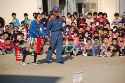 11/12火災避難訓練 公開日 2015/11/12 更新日 2015/11/12 全校 11月12日(木)5時間目に、全校で火災避難訓練を行いました。 避難完了後、消防署の方から消火器の使い方について教えていただき、代表児童が模擬消火器を使って消火の練習をしました。 その後、5年生が煙道体験、6年生が避難器具を使った3階からの降下訓練を行いました。