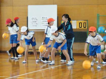 11月13日(金)5時間目,4年2組西村 遥先生が体育科「ポートボール」で研究授業を行いました。準備運動でサーキットトレーニングをとり入れたり,夏休みの研修で教えていただいたパスやドリブル練習をとり入れたりして授業を行いました。チーム全員で協力し,得点につなげ,全員の体力向上をめざしました。