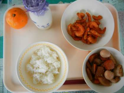 ごはん ぎゅうにゅう みそおでん あかしゃえびのからあげ みかん