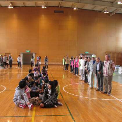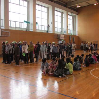 11月22日(日)時々晴れ間がのぞく曇り空でしたが,暖かな日に本校体育館やグランドで岡田コミュニティ環境福祉部会主催三世代交流を行いました。32組の親子,岡田コミュニティ関係者の皆様,岡田子ども会,長寿会・長生会の皆様,岡田街並保存会・岡田ゆめみたいの皆様など,60名近い方々が参加しました。写真は開会式の様子です。