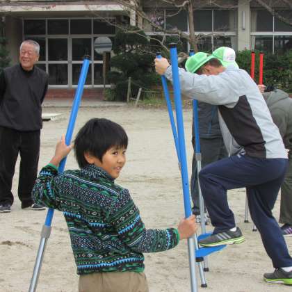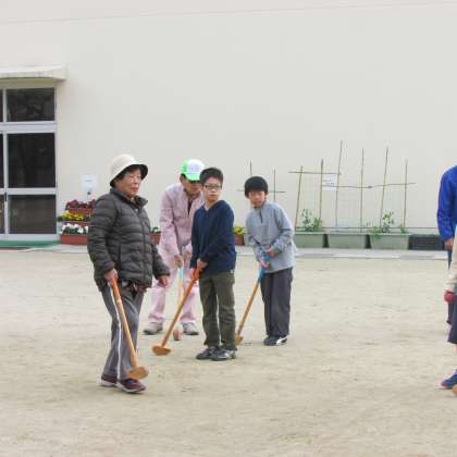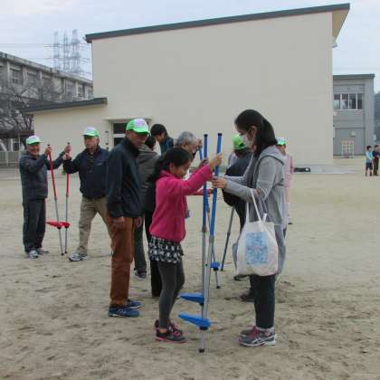 グランドではグランドゴルフ・竹馬を,コミュニティ,長寿会・長生会の方々に親子が教えてもらいなから取り組みました。とても楽しい1日を三世代で楽しみました。