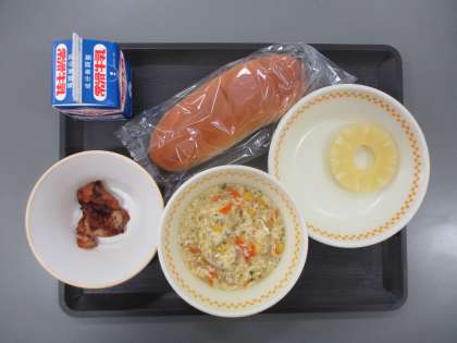 10/12(木) 給食 公開日 2023/10/12 更新日 2023/10/12 給食 今日の献立は ミルクロールパン ぎゅうにゅう とりにくのハーブやき コーンたまごスープ スライスパインかん です