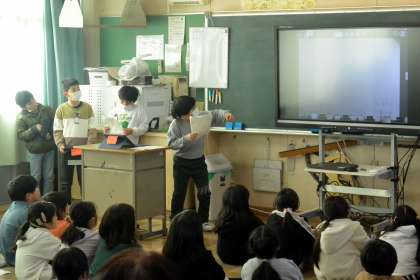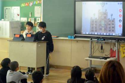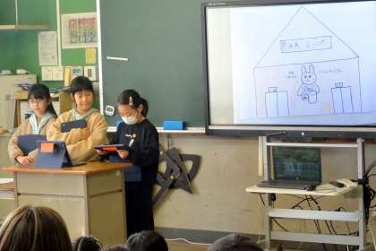 2月8日 3年「学んだこと発表会」 公開日 2024/02/08 更新日 2024/02/08 全校 総合:岡田に作ろう!自分の店 総合学習で学習した「岡田」の特色をふまえて, 岡田にあったらいいなと思う店を考えました。 テーマごとにグループ発表しました。 タブレットを操作したり、電子黒板を指さしたりして 伝わるように プレゼンしました。