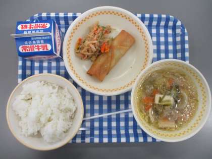 今日の献立は ごはん ぎゅうにゅう はるまき きりぼしだいこんのちゅうかサラダ はっぽうたん です