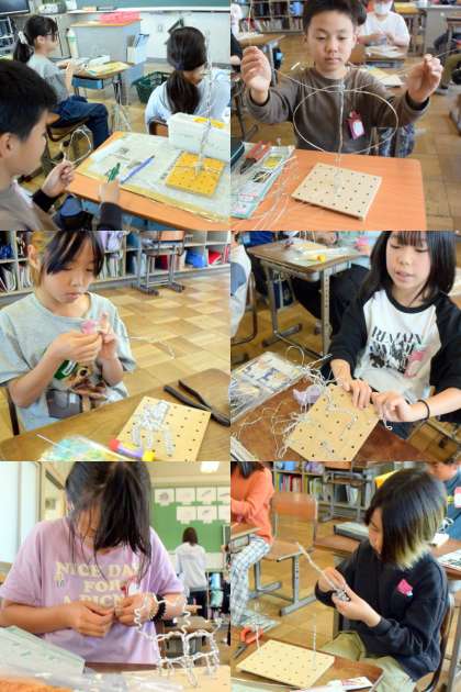 5月8日 5年図工「美しく立つはり金(立体)」 公開日 2024/05/08 更新日 2024/05/08 5年生 針金を曲げたりつなげたりして、 いろいろな巻き方を試します。 「何を作ろうかなぁ・・・」