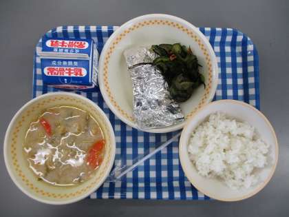 今日の献立は ごはん ぎゅうにゅう さばのぎんがみやき やさいのしそひじきあえ ごじる です