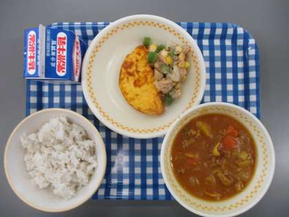 今日の献立は むぎごはん ぎゅうにゅう こめこのカレーライス オムレツ アスパラガスのサラダ です