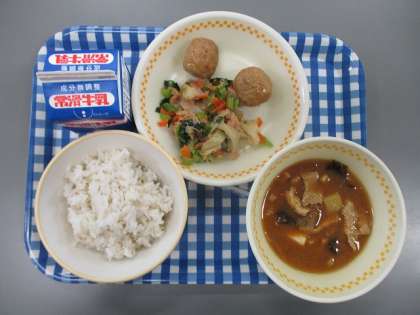 今日の献立は むぎごはん ぎゅうにゅう レバーいりつくね やさいとツナのあえもの たまねぎのみそしる です