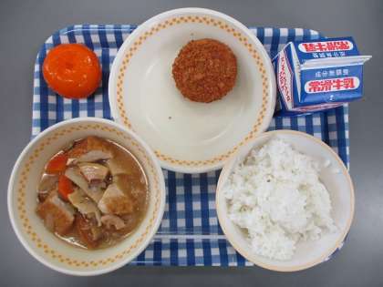 今日の献立は ごはん ぎゅうにゅう わふうコロッケ なまあげのうまに れいとうみかん です