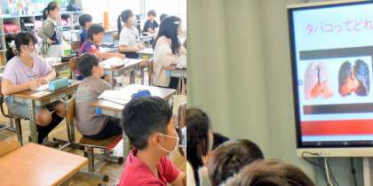 5月31日 6年体育「保健 病気の予防」 公開日 2024/05/31 更新日 2024/05/31 6年生 (めあて)喫煙が体に与える影響について考えよう。 先生が 一枚の写真を 電子黒板に写すと・・・ 「うわっ」 真っ黒な肺の写真が・・・