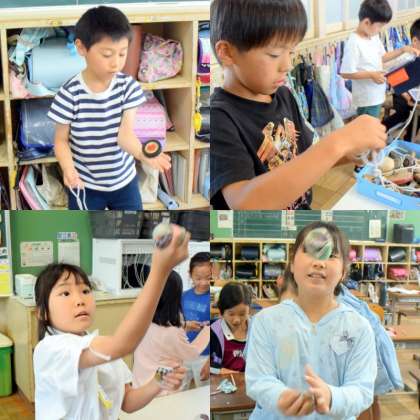 コマ回しに お手玉 どれだけ長く 回せるかな? ぼくは 手のひらで 回せるよ !