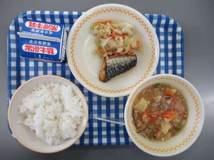 今日の献立は ごはん ぎゅうにゅう さばのしおやき じゃがいものそぼろに キャベツとたくあんのごまあえ です