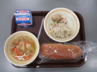 今日の献立はソフトめん ぎゅうにゅうにくみそかけあげざかな(たら)のくろずあんか...