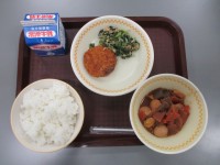 今日の献立はむぎごはん ぎゅうにゅうハヤシライスとうふバーグのあんかけみかん で...