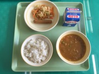 今日の給食ご飯牛乳あじフリッタービビンバピリ辛汁
