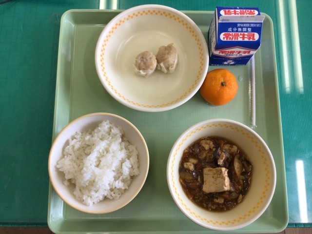 ご飯・牛乳・県産おからと大豆のシュウマイ・茄子入り麻婆豆腐・冷凍みかん
