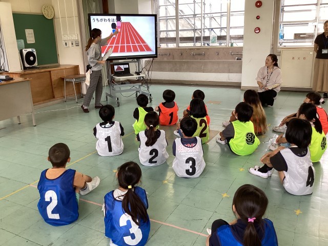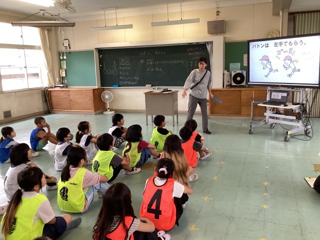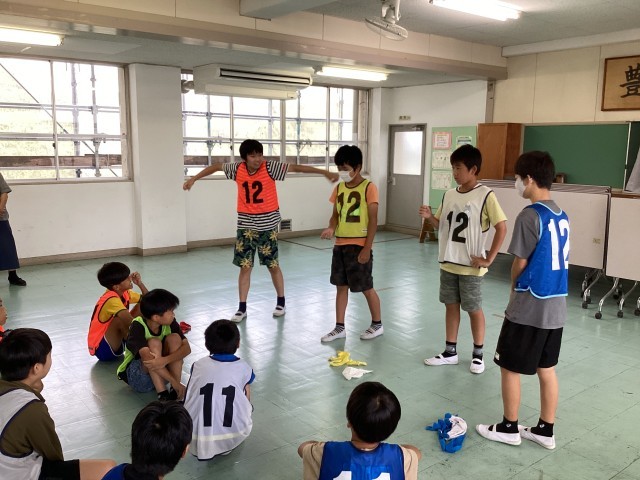 大放課に運動会の団別対抗リレーに出場する選手顔合わせ会が行われました。赤・白・青・黄の各団から選ばれた代表が顔合わせをし、ルールの確認やスタートコースの決定などを行いました。